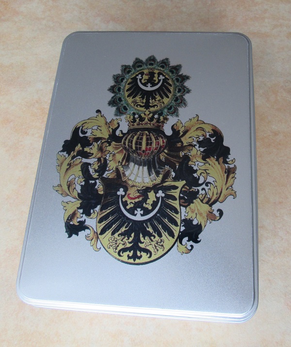- Plechová dóza velká stříbrná s úplným znakem Slezského knížectví