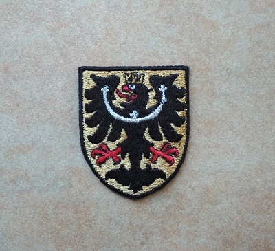 CELOPLOŠNÝ vyšívaný slezský znak (menší provedení) s heraldickými kovovými barvami, zlatá i stříbrná barva je vyšitá nití obsahující kovy jmenovaných barev.
